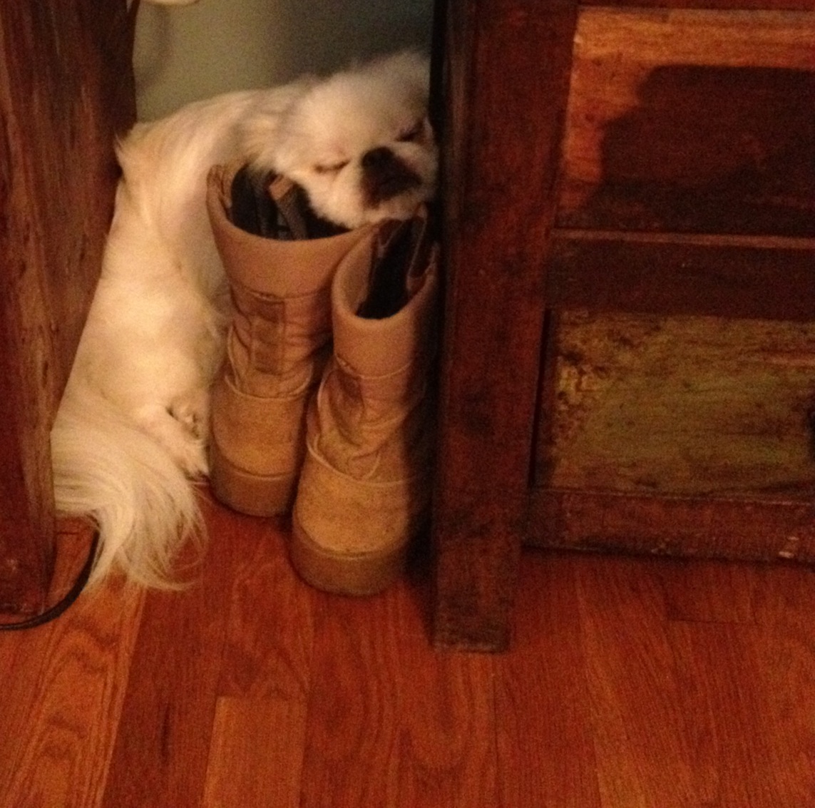 Connor is a beautiful and sweet 7 year old Pekingese who is being fostered in N.Va. He loves children and is a really nice boy. Connor's foster mom is going on a 3 month assignment and we need to move him to another foster home. It needs to happen soon (we've been working on this). His foster mom sent me his picture-- he loves to sleep here. That doesn't look comfortable at all! But, he loves it!