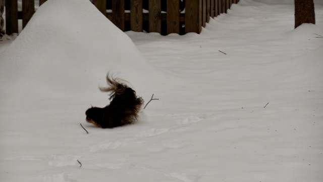 Grace was disgusted by it all! Her legs are short and she had to either plow through the snow or leap along! She was trying to find a place to go potty-- that was tough!