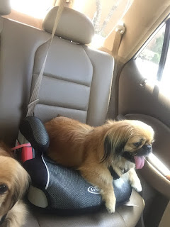 I noticed that BeeBee's tongue was more pale than it had been last week. She also had another break through seizure, so we needed to have her phenobarbital levels checked. Nala decided she would ride in Beach Bit's booster seat-- it gave her a much better view of the road.